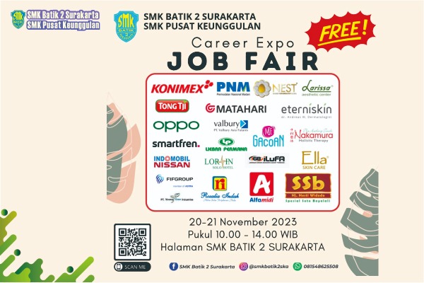 BKK SMK Batik 2 Surakarta mempersembahkan Career Expo (Job Fair). BKK SMK Batik 2 Surakarta mengadakan kegiatan Job Fair sebagai upaya penyaluran siswa ke dunia kerja. Tujuan utama dari job fair tersebut adalah agar para calon lulusan bisa belajar untuk mengetahui bagaimana bentuk suatu lingkungan pekerjaan sesuai bidang yang kamu inginkan.